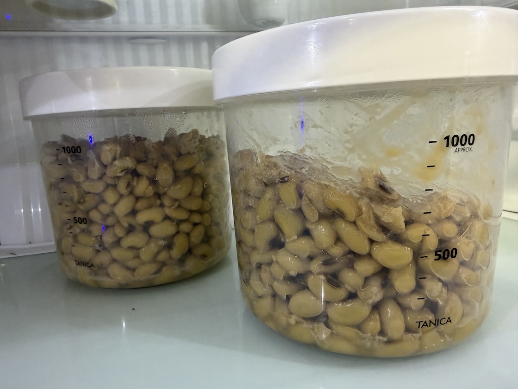 大豆を茹でて納豆器を加え、ヨーグルティアで24時間発酵させて1日冷蔵庫で寝かせて出来上がりの代物です。
