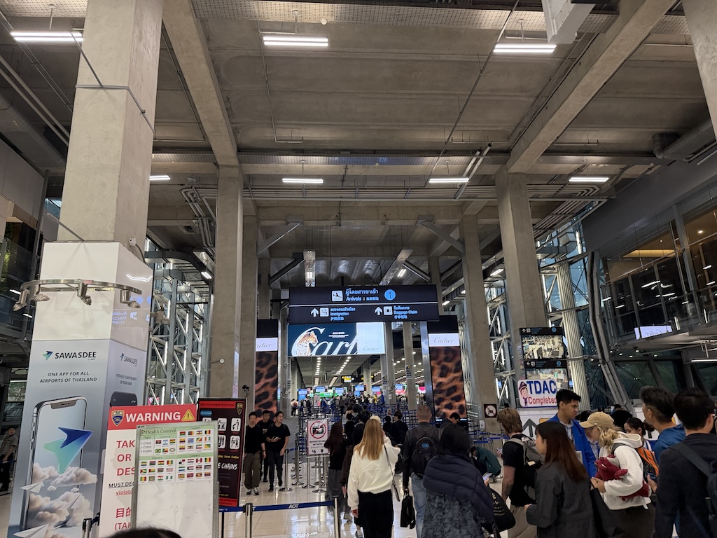 今年からTDAC(電子入国カード)を事前申請する必要があることに伴い、入国審査が有人ゲートオンリーになってて入国審査待ちの人々でごった返していた。